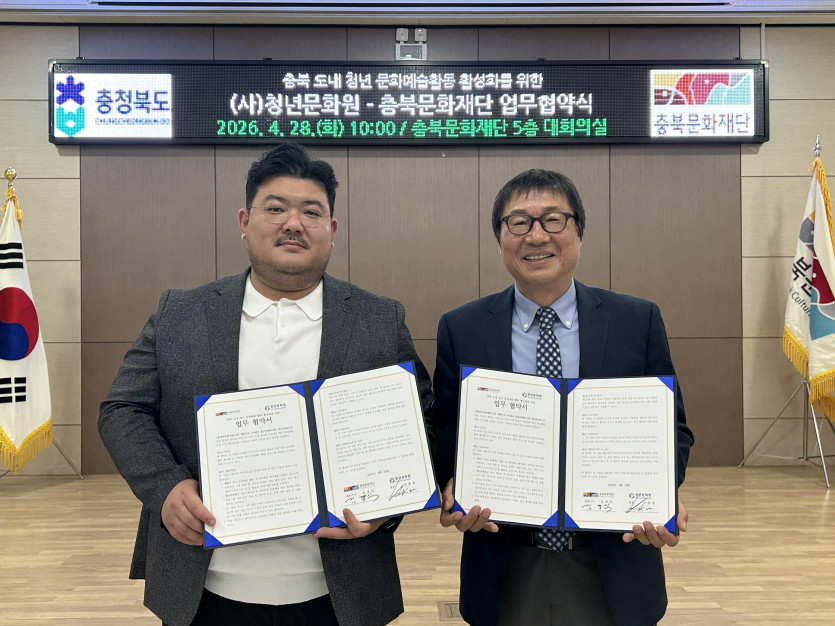 (재)충북문화재단(대표이사 김경식)과 사단법인 청년문화원(원장 김흥용)은 28일 충북 도내 청년의 문화예술 활동 활성화 및 지역사회 발전을 위한 업무협약(MOU)을 체결했다.